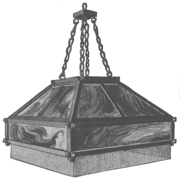 The ceiling lamp shade shown in the Mission style is constructed of wood and glass.