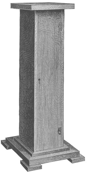 The illustration shows a unique article for the den. It serves as a Mission style pedestal and has one side which opens on hinges allowing the inside to be used as a smoker’s cabinet or cellarette. All the lines are straight and the corners square, making it easy to construct.
